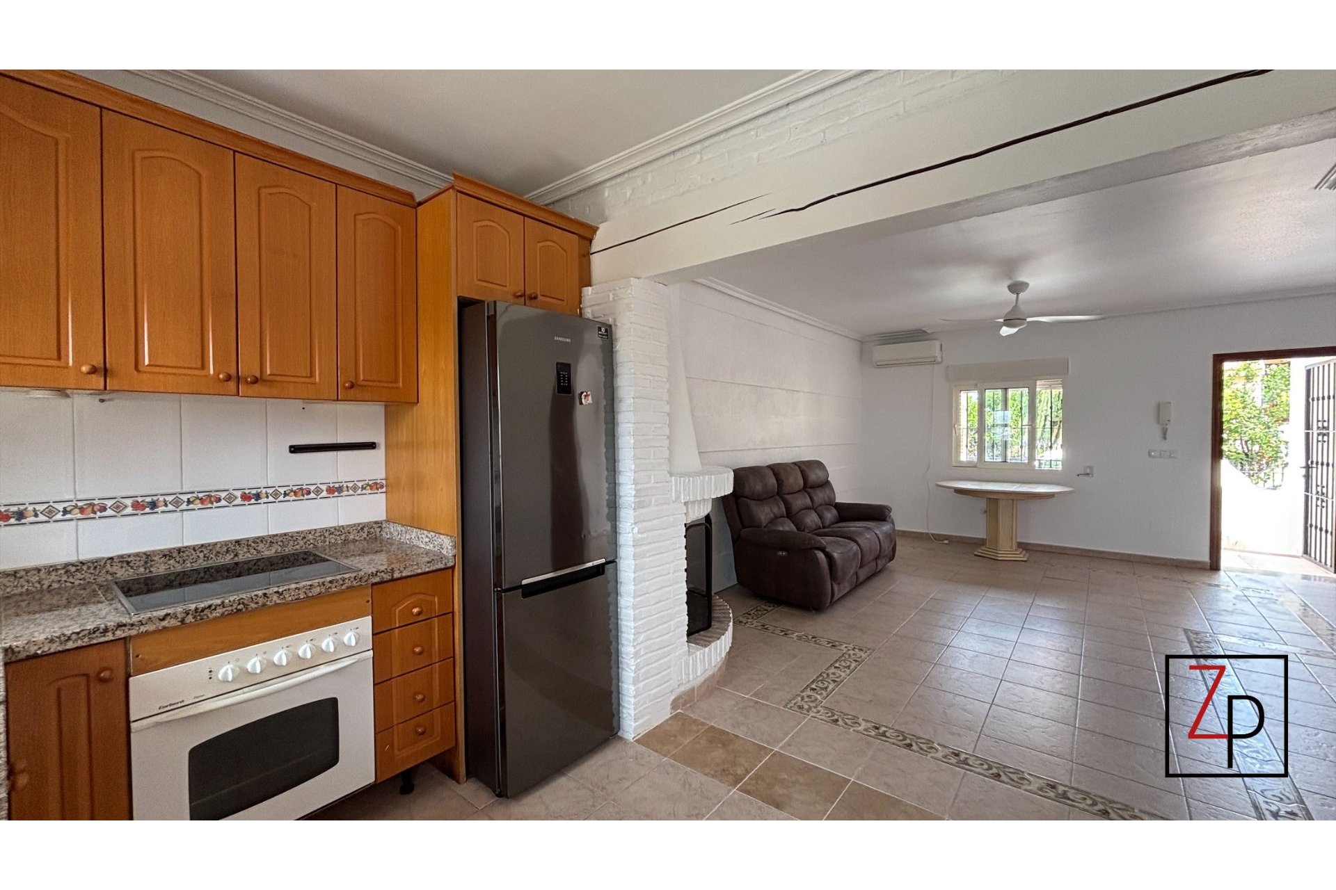A spacious living room with a fireplace, a toilet, and an open kitchen that leads to the rear terrace.
